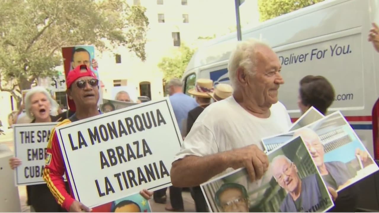 El vestido largo de color azul y de mangas largas, con estampado de hojas y óvalos, levantó críticas en el exilio cubano y se hizo viral en redes sociales.