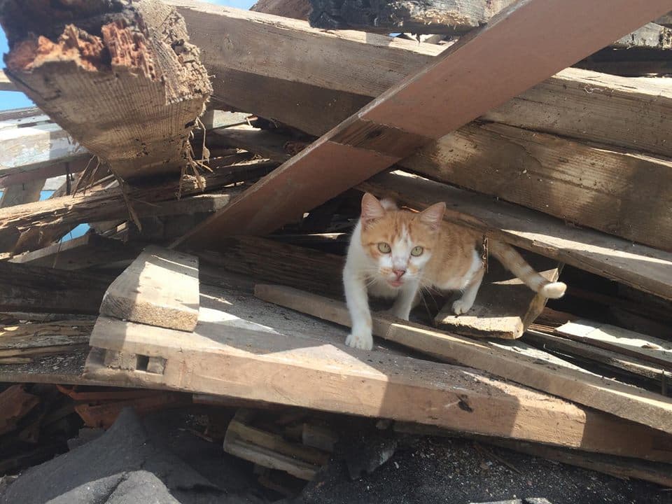 Hay un gato, el gato de Mercedes y sus hijos, que camina entre los escombros todo el tiempo. Parece el único ser vivo en un pedazo del fin del mundo.
