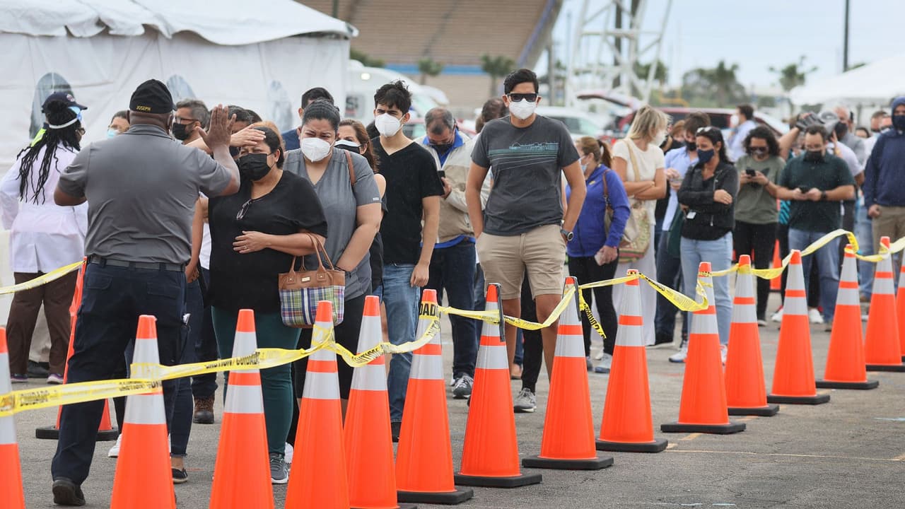 Largas filas en el Miami Dade College North Campus para recibir la vacuna contra el coronavirus