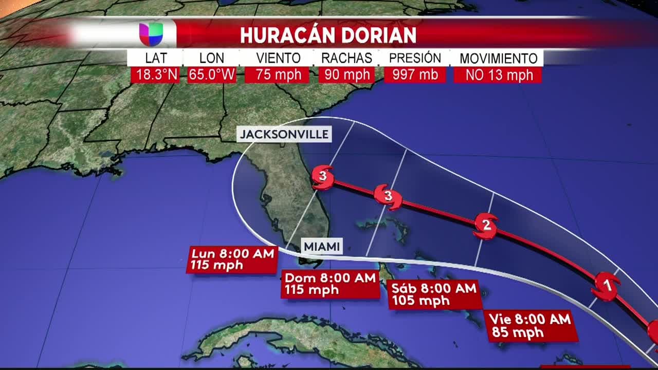 El meteorólogo Eduardo Rodríguez, de Noticias 23, también indica que una baja presión que controlará el movimiento y la intensidad del fenómeno durante las próximas 48 horas, desaparecerá, dejando paso a un anticiclón, que empujará a Dorian hacia Florida.