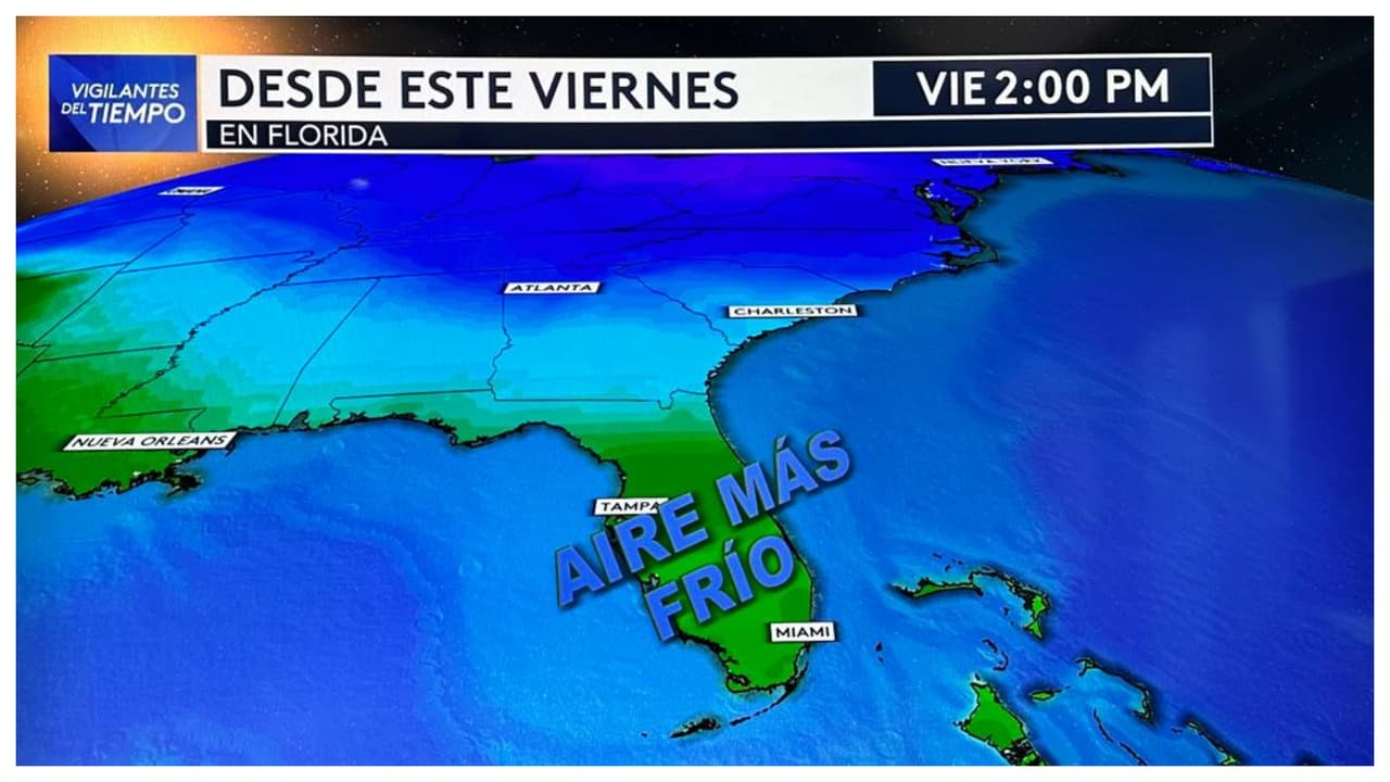 De acuerdo con Javier Serrano, meteorólogo de Noticias 23 Miami, el frente llegaría el jueves en horas de la noche y a su paso traería algunos chubascos, pero sobre todo un descenso de las temperaturas el fin de semana.