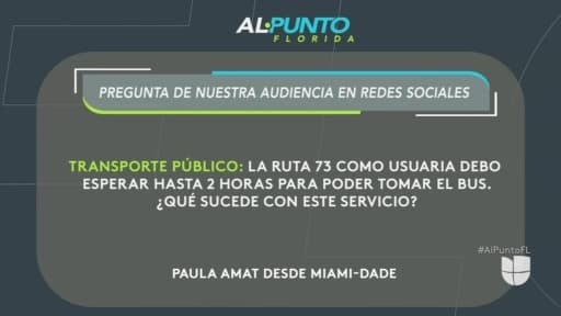 En Univision 23 consultamos a nuestra audiencia sobre qué le preguntarían a la alcaldesa Daniella Levine-Cava. Paula Amat nos hizo llegar este comentario: "Con respecto al transporte público, en especial la ruta 73, como usuaria diaria, hay días que debo esperar hasta dos horas. ¿Qué sucede con el servicio?"