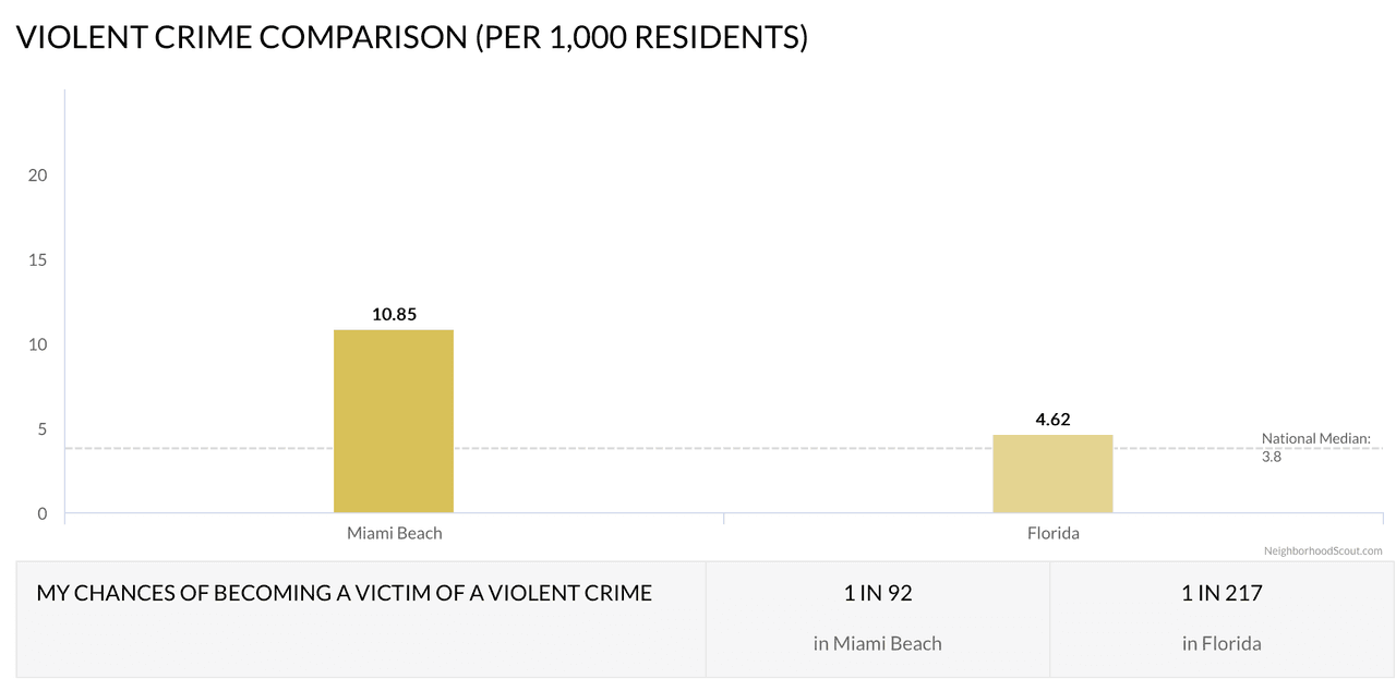 Según las cifras de NeighborHood, Miami Beach reportó 1,002 crímenes violentos y 9,039 crímenes por robos de propiedad, en el último año. Uno de cada 92 residentes de Miami Beach puede ser víctima de un ataque, una cifra alarmante al compararla con Florida donde uno de cada 217 residentes puede ser propenso a un ataque.