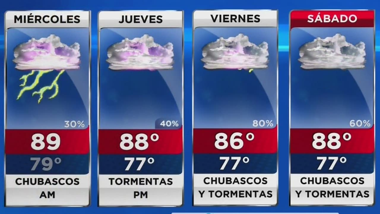 La lluvia se mantiene en todo el sur de Florida, específicamente este miércoles se sentirá con más fuerza en horas de la mañana. La máxima temperatura será de 89 grados, y la mínima de 79 grados.