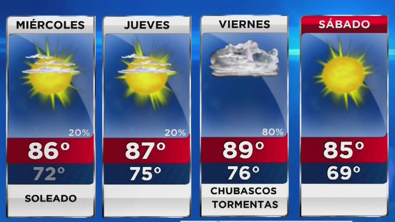 Contrario a las lluvias del martes, este miércoles sale el sol y sube la temperatura en Miami. La máxima será de 86 grados y la mínima de 72 grados. El viernes vuelve la nubosidad y las precipitaciones, con posibilidad de tormentas eléctricas.