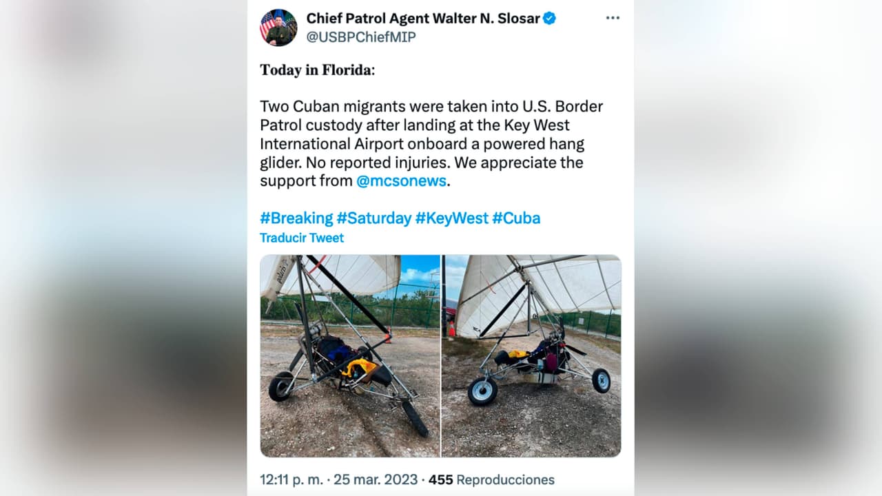 “Dos migrantes cubanos fueron puestos bajo custodia de la Patrulla Fronteriza después de aterrizar en el aeropuerto internacional de Cayo Hueso a bordo de un ala delta motorizada. No se reportaron heridos”, dijo en un tuit Walter N. Slosar, jefe de la Patrulla Fronteriza en el sur de Florida.