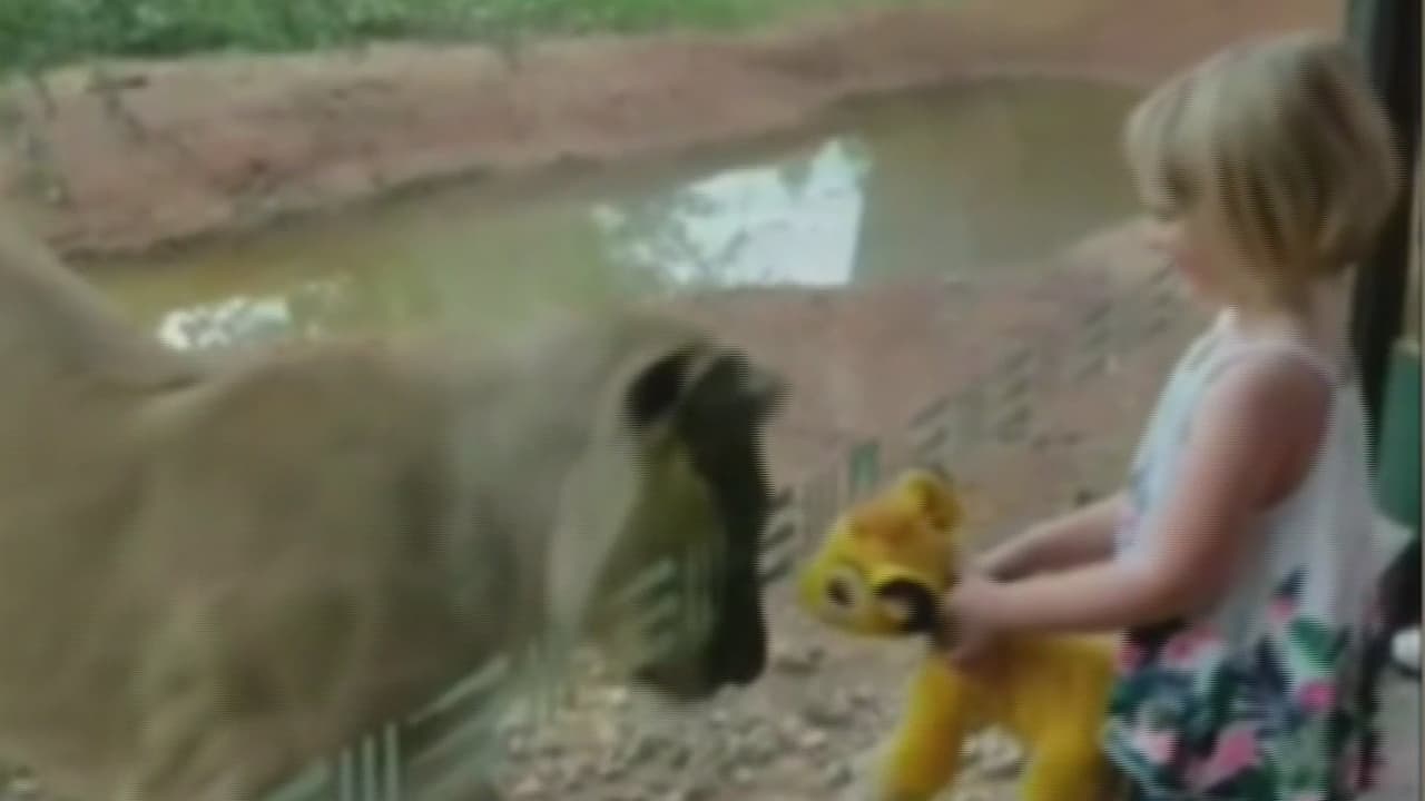 Mira la maternal reacción de una leona cuando una niña se le acerca con un muñeco de peluche