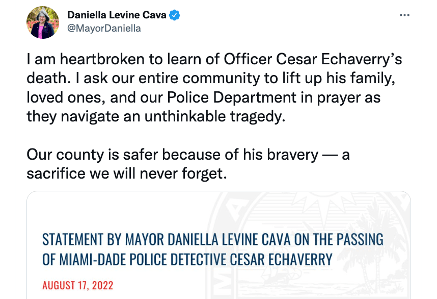 El jefe de la policía de Miami-Dade, Alfredo Ramírez, fue quien informó del fallecimiento del oficial: "Sucumbió a sus heridas después de una breve batalla por su vida", escribió en Twitter.