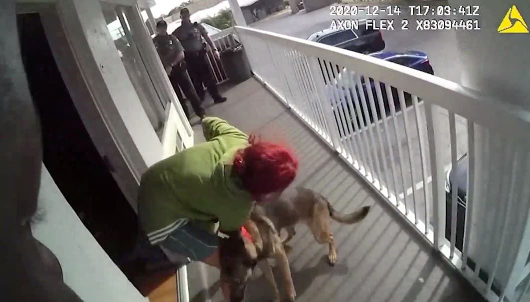 La mujer había amenazado primero con lanzarse ella y empleados del motel donde ocurrió el incidente llamaron a la policía. El momento en que lanza al perro desde la terraza quedó grabado por la cámara corporal de un oficial.