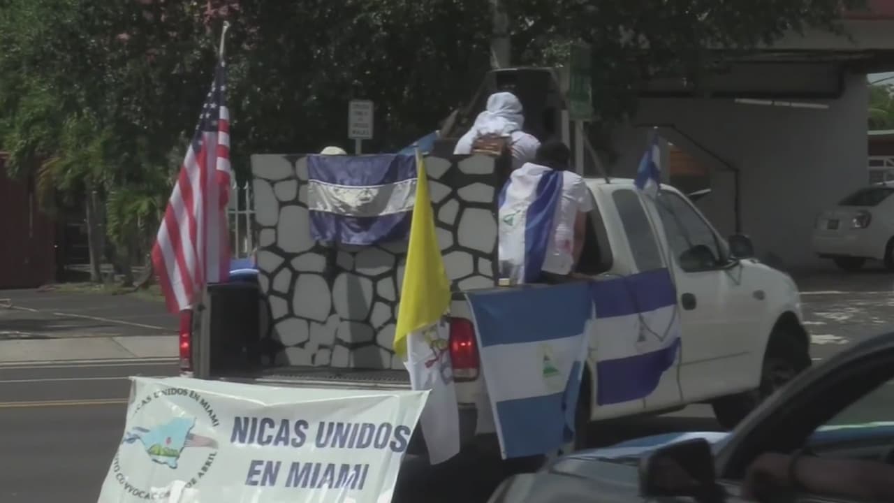 Miembros de la comunidad nicaragüense en Miami se congregaron este sábado afuera de la iglesia San Miguel Arcángel, en el vecindario de West Flagler, para unirse a una caravana que recorrió las principales calles de la ciudad hasta el Parque Rubén Darío.