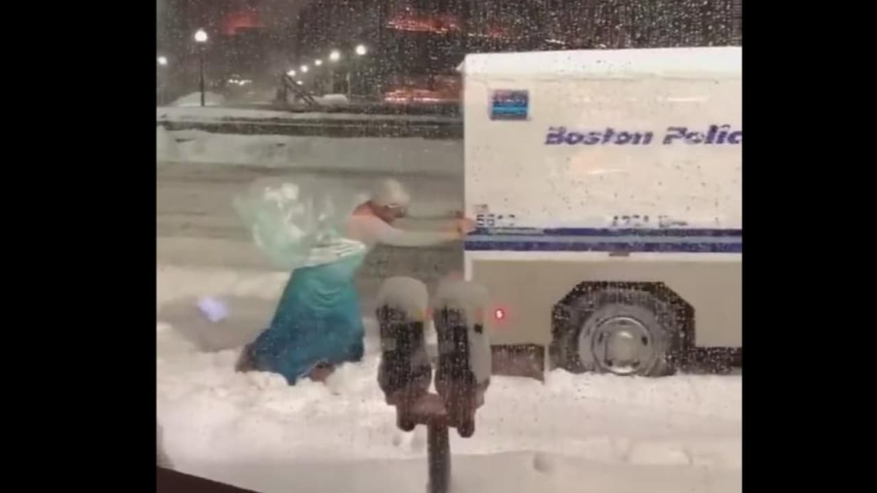 Un hombre vestido como la protagonista de la famosa película animada de Disney fue grabado mientras empujaba una camioneta policial en medio de la nieve en Boston mientras que los espectadores aplaudían y gritaban "Let it go".