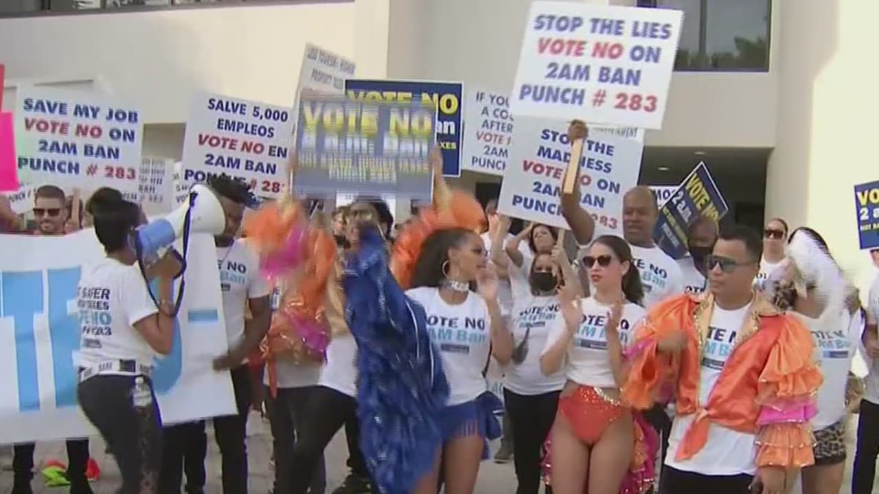 A ritmo de música latina, los manifestantes llegaron hasta el ayuntamiento para entregarle una carta al alcalde de la ciudad con una petición de que no reduzca el horario para vender bebidas y licores. Según ellos, esto sería un duro golpe para sus negocios en medio de la recuperación económica tras las restricciones por la pandemia.