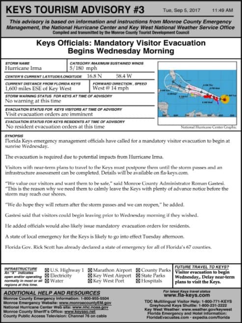 El Director de Manejo de Emergencias del Condado de Monroe, Martin Senterfitt, confirmó en la mañana del martes que emitirá una evacuación obligatoria de visitantes que se espera comience en la mañana del miércoles