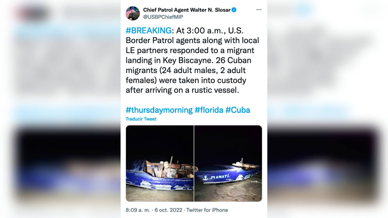 De acuerdo con la Patrulla Fronteriza, los 26 balseros cubanos que llegaron a las costas de Key Biscayne fueron detenidos aproximadamente a las 3:00 am de este jueves. Entre los migrantes había 24 hombres adultos y 2 mujeres adultas.