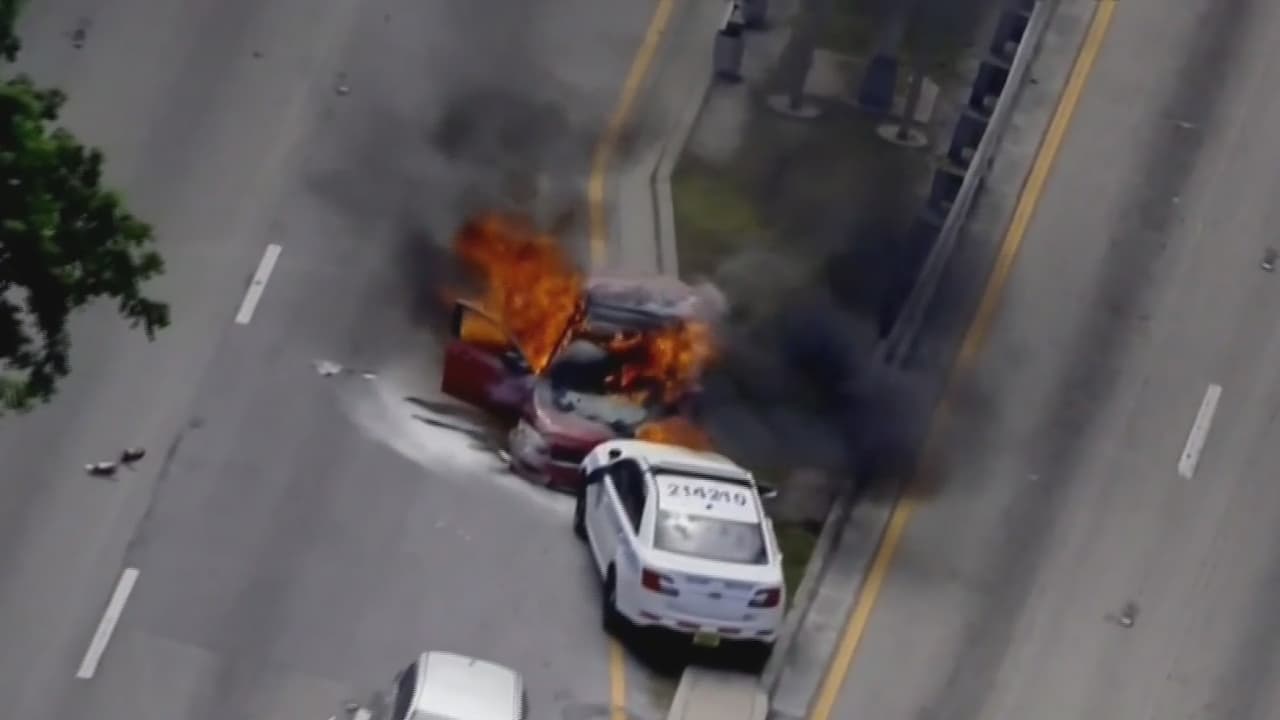 Persecución policiaca en Miami termina en un accidente que dejó un vehículo prendido en llamas