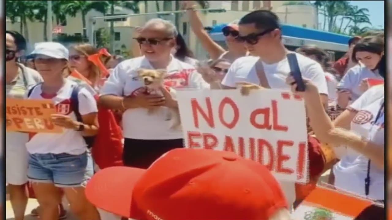 Peruanos se reúnen en Miami Beach para rechazar las elecciones en su país, asegurando que hay un fraude