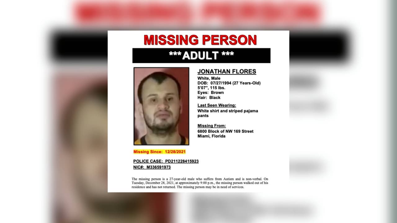 Jonathan Flores fue visto por última vez en el bloque 6800 del noroeste y la calle 169, el martes a las 9:00 pm, llevaba puesta una camisa blanca y pantalones de pijama a rayas. El hombre de 27 años no se comunica verbalmente y es autista. Piden a quien tenga información que se comunique con la policía de Miami-Dade al 305-715-3300.