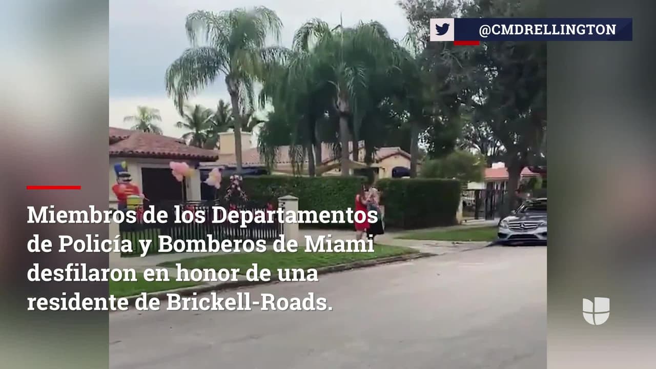 Miembros de los Departamentos de Policía y Bomberos de Miami desfilaron en honor de una residente de Brickell-Roads, la señora Dimitra Marsellos celebró su cumpleaños 87 en casa con su familia.