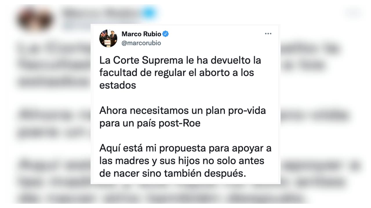 Marco Rubio, uno de los senadores republicanos del estado en Washington D.C., dijo que “hoy, la Corte Suprema devolvió correctamente el poder de regular el aborto a los estados” y presentó una propuesta para “un plan pro-vida para un país post-Roe”.