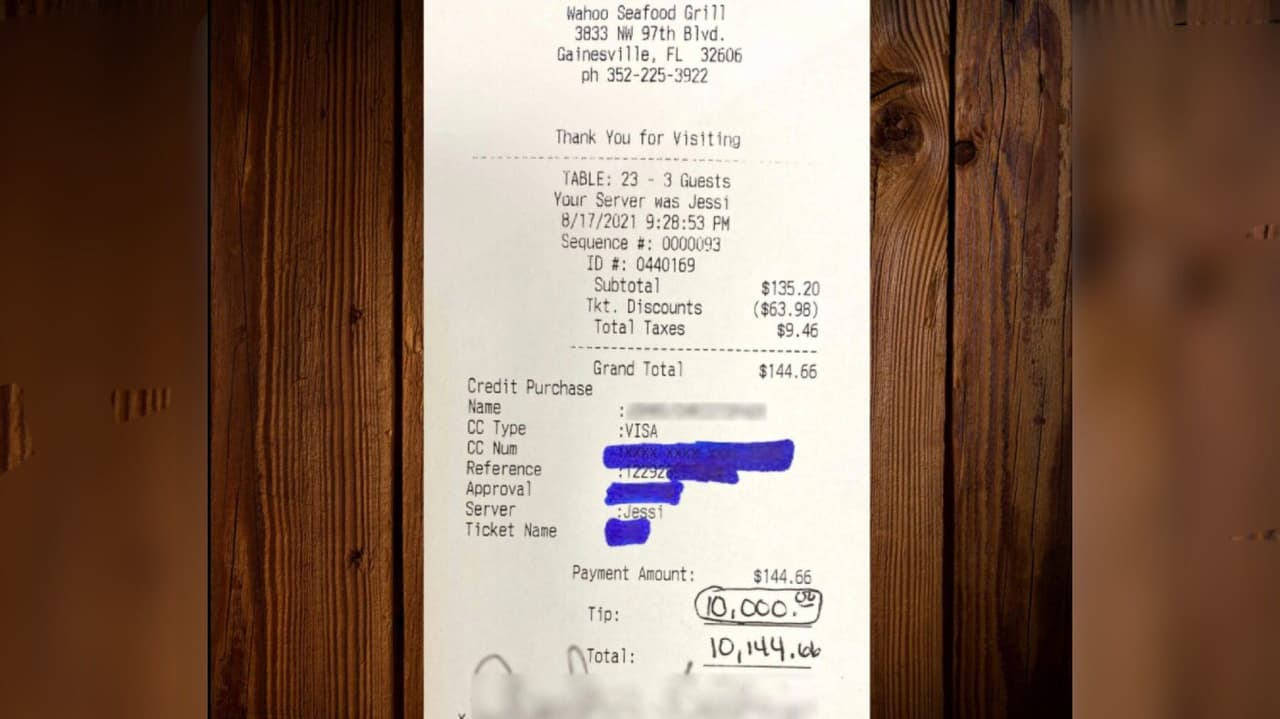 Los trabajadores del Wahoo Seafood Grill, en Florida, quedaron sorprendidos con el gesto de un cliente quien les pidió que fueran al comedor y luego les dijo que les daría $1,000 a cada uno. En total el hombre dejó $10,000 de propina, aunque su cuesta solo fue $144,66 por comer en este restaurante de mariscos.