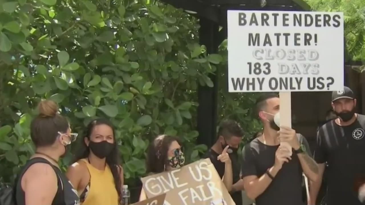 Decenas de empleados de los bares y discotecas del condado Miam-Dade manifestaron pacíficamente, para pedir al alcalde Calos Giménez que abran estos locales.