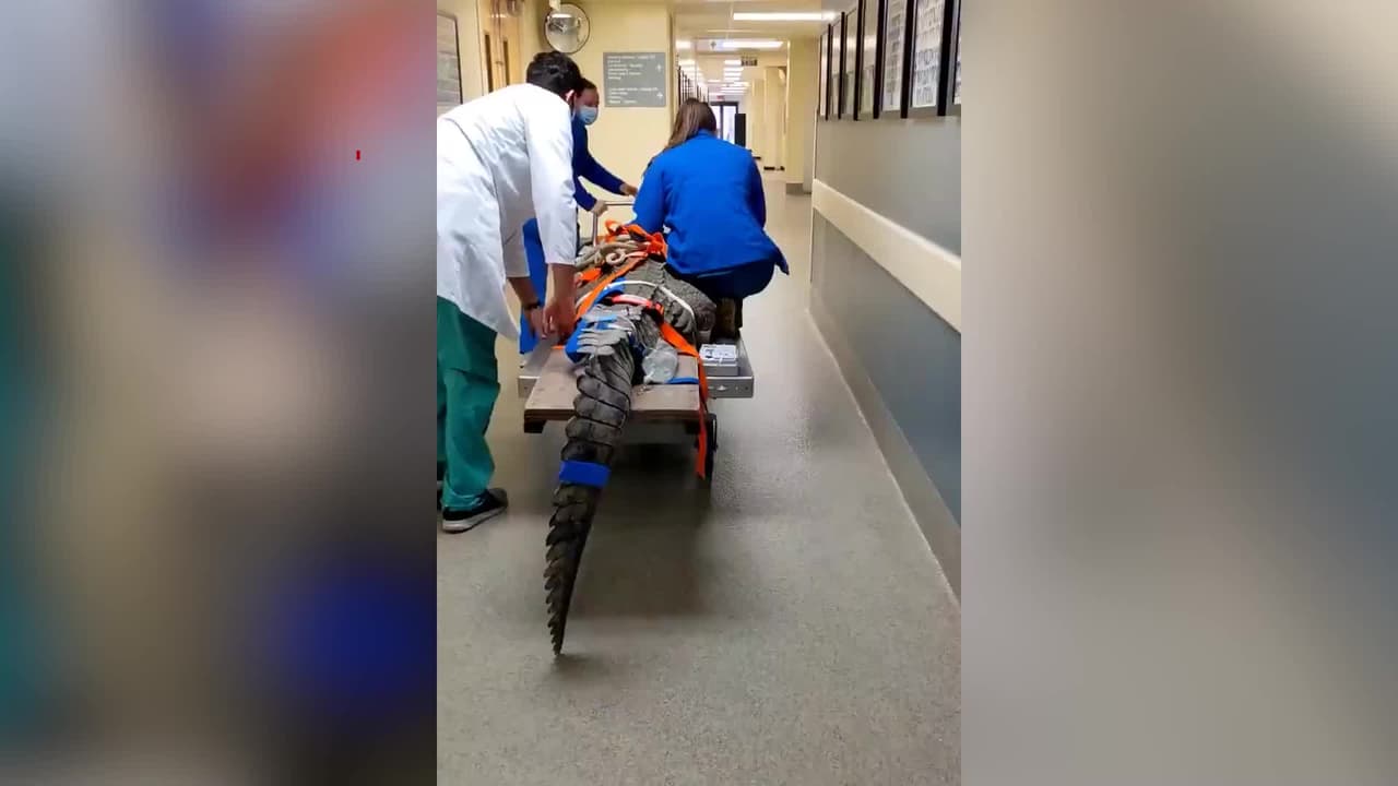 El momento en que el enorme cocodrilo fue conducido por el personal médico en una camilla a una sala de operaciones fue grabado en video.