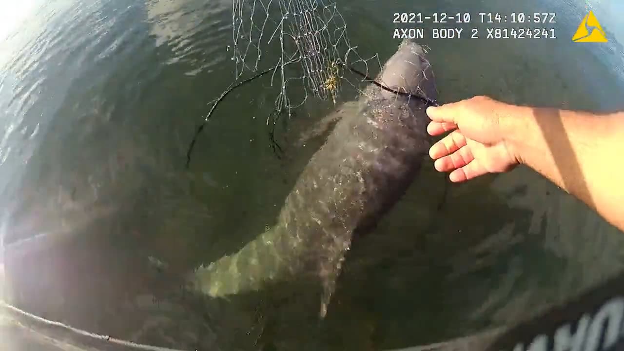 La unidad de patrulla marina de Miami-Dade recibió una llamada que los alertó de un delfín atrapado con una red en la bahía. El oficial Nelson Silva navegó hasta el lugar y su cámara corporal grabó el rescate del animal.