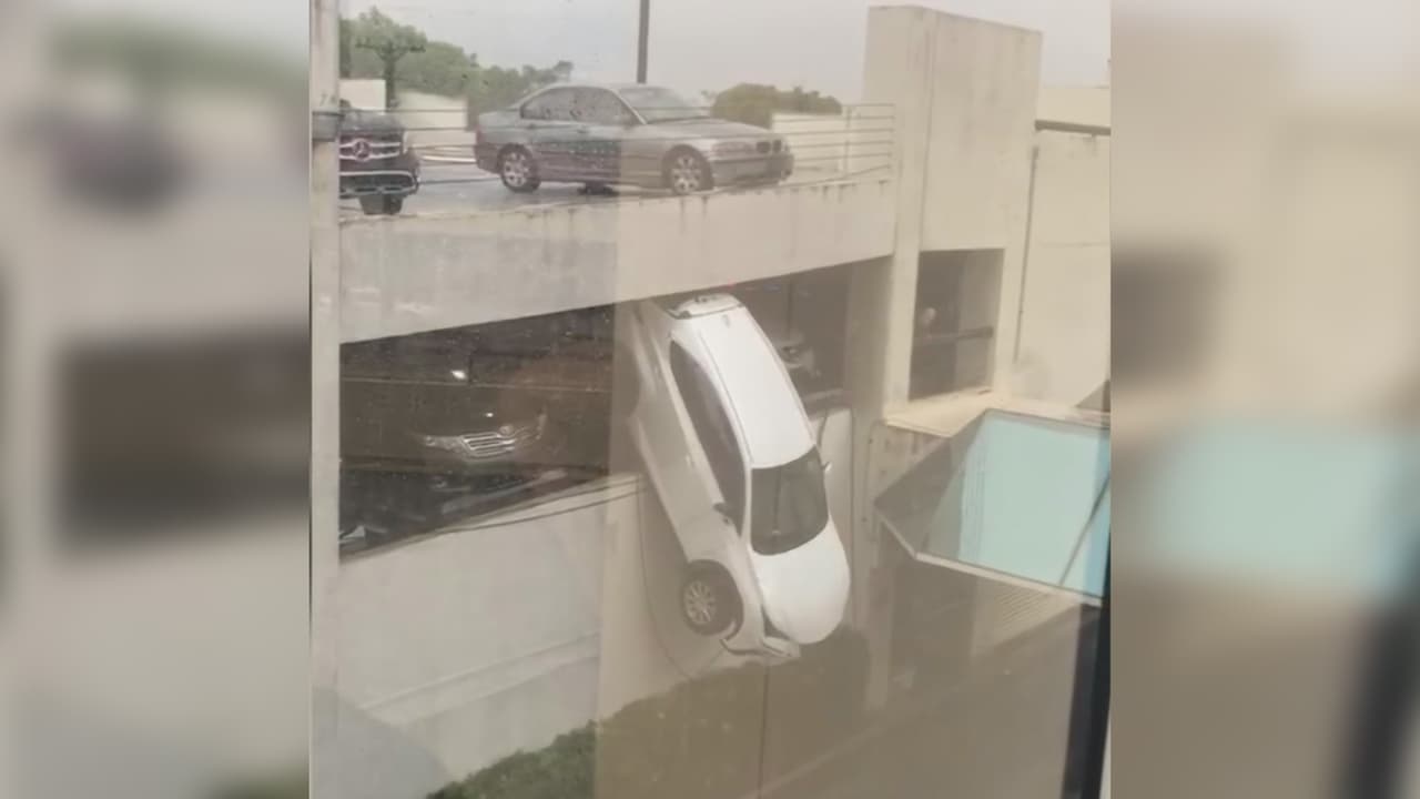 Rescatan a una mujer de un auto que quedó colgando en un estacionamiento de Miami Springs