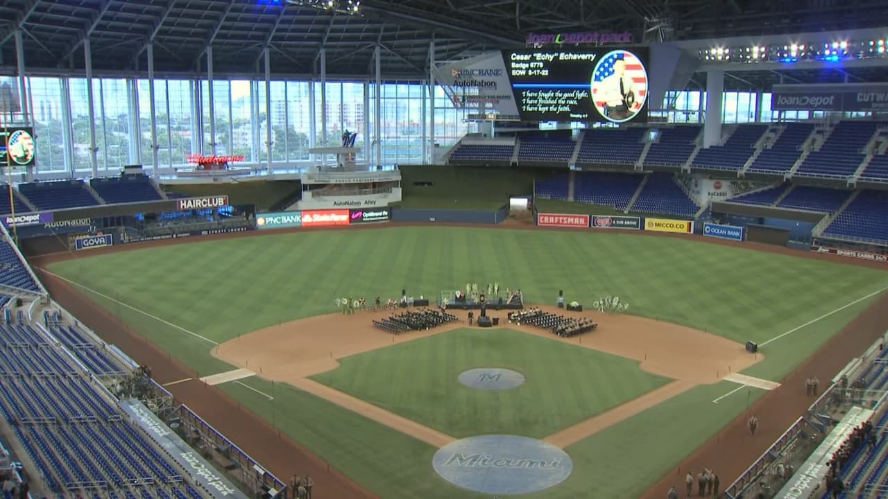 La policía de Miami-Dade organizó un emotivo tributo al oficial Cesar Echaverry, en el Loan Depot Park, la casa de los Miami Marlins. A una semana de su muerte, sus familiares, amigos, colegas, políticos y agencias del orden, participaron en la ceremonia para rendirle honores al policía, a quien describieron como un héroe del sur de Florida.