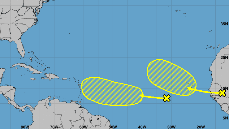 El Centro Nacional de Huracanes vigila dos áreas de mal tiempo. Una, sobre el Atlántico central se mueve al oeste acercándose al Caribe y la otra saliendo de África. Esta es la posibilidad de desarrollo tropical que le ofrecen.
