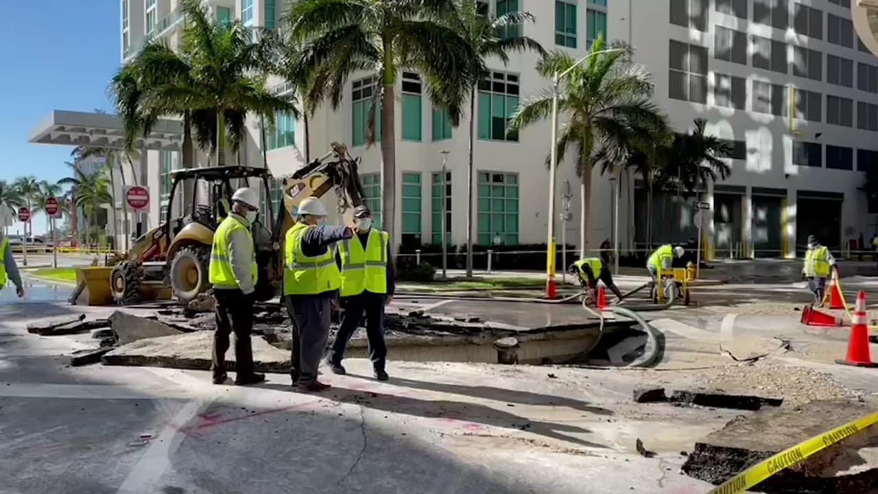 Una tubería de agua de 13 pulgadas se rompió y el agua inundó la zona en la mañana de este miércoles. Varios obreros están trabajando para repararla, por lo que se suspendió el servicio del Metromover y no hay paso en varias calles del Downtown de Miami