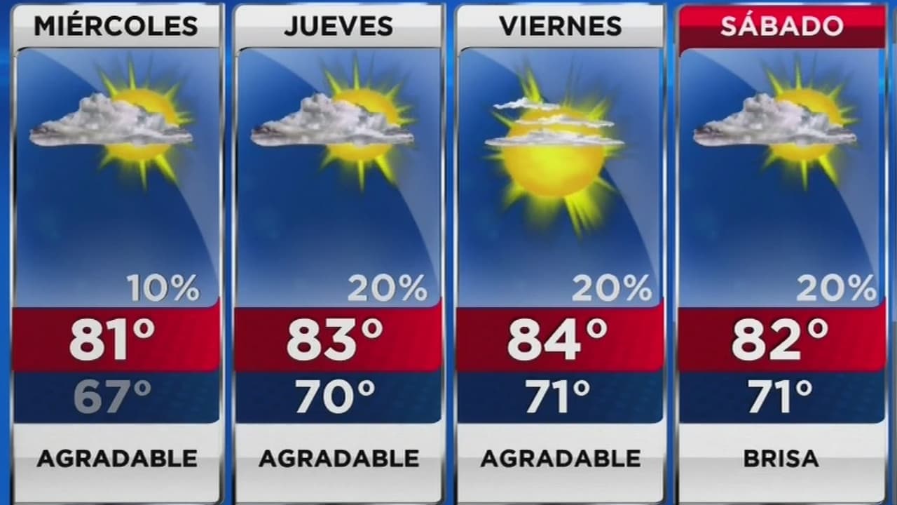 La temperatura estará por encima de lo registrado en los últimos días, pero permanece fresca. La máxima para hoy será de 81 grados, con viento calmado, cielo ligeramente nublado y baja probabilidad de lluvia.