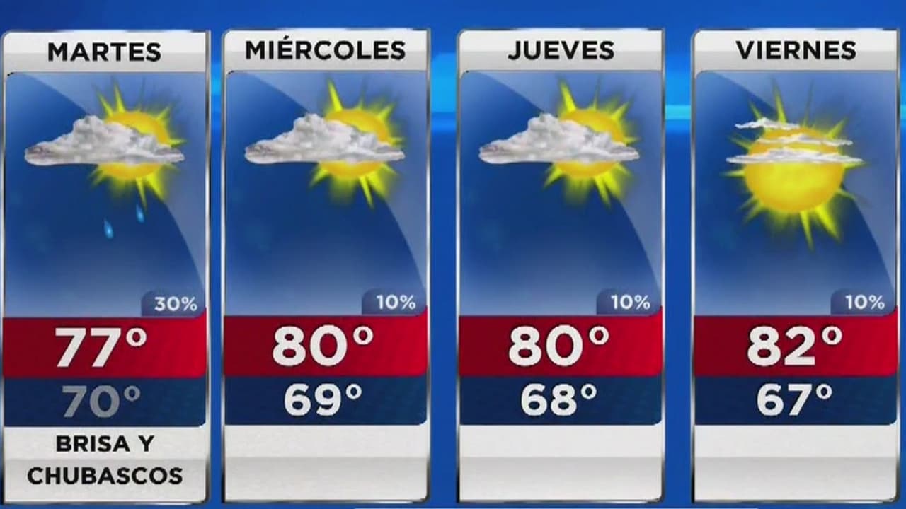 Se mantienen las brisas que han favorecido la propagación de incendio en el condado Miami-Dade, que también provoca chubascos ligeros. Además, puede afectar a bañistas y propietarios de embarcaciones pequeñas. La temperatura máxima será de 77 grados y la mínima de 70 grados.