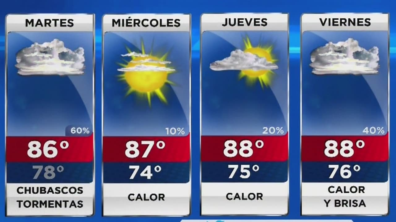 El cielo estará nublado la mayor parte del día, dándole paso a la lluvia y posibles tormentas eléctricas. La máxima temperatura para este martes será de 86 grados, y la mínima de 78 grados. Se espera un miércoles soleado.