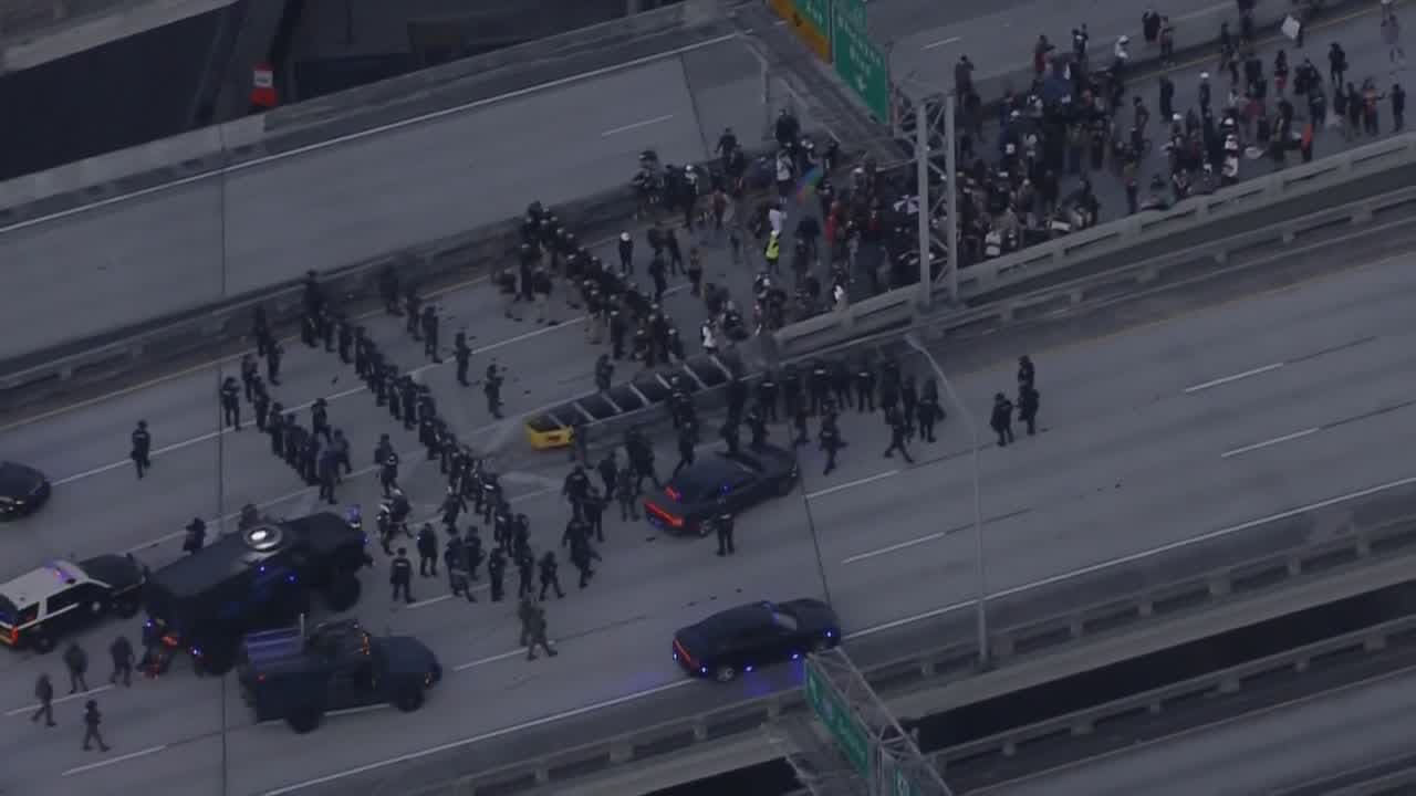 Los participantes en las protestas del viernes en Miami intentaron subir a la autopista I-95, pero la policía se los impidió. Pasada cerca de una media hora los manifestantes se retiraron de forma pacífica.