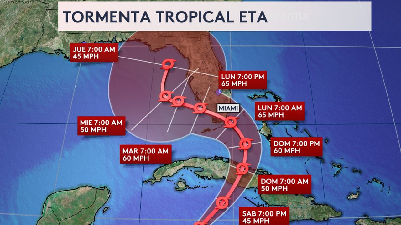 La lluvia que afecta a la isla ha comenzado a llegar al sur de Florida, donde se ha emitido una vigilancia por posibles inundaciones hasta el próximo martes. También hay advertencia por la posibilidad de que Eta se convierta en huracán y por marejada ciclónica.