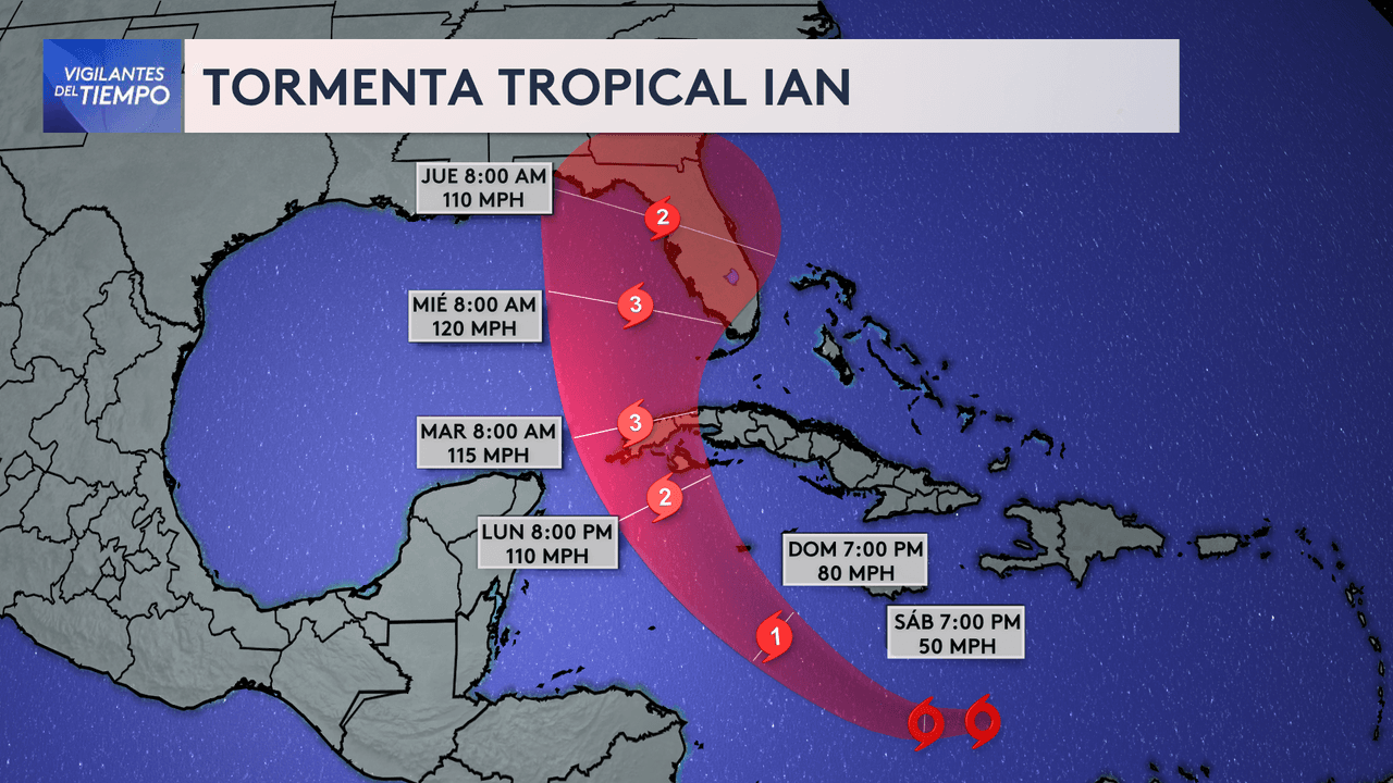 De acuerdo con el boletín de las 11:00 am de este sábado del Centro Nacional de Huracanes, Ian se convertiría en un huracán categoría 1 en la noche del domingo o madrugada del lunes y pasaría a categoría 2 cuando toque el oeste de Cuba el lunes en la noche.