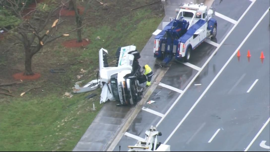 Varios autos estacionados en un colegio universitario y un camión que viajaba en el Florida Turnpike resultaron volcados por el paso de un tornado.