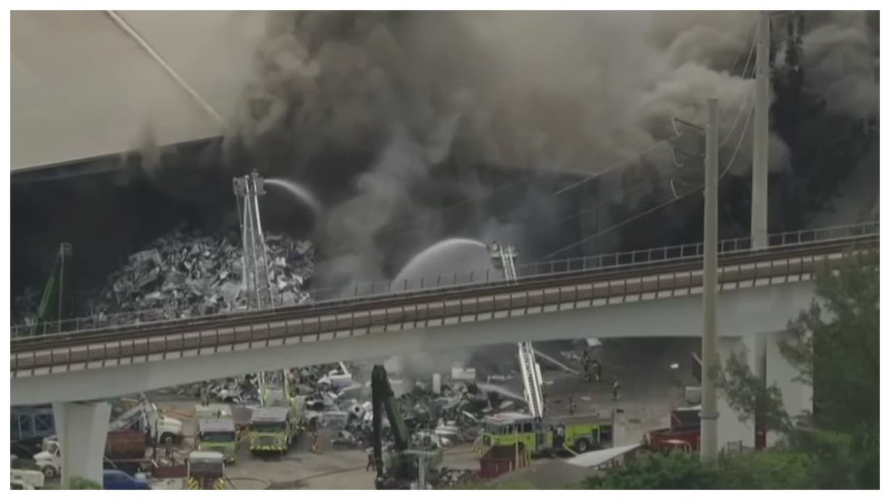 Una densa columna de humo cubrió el noroeste de Miami tras incendio en planta de chatarra y metal