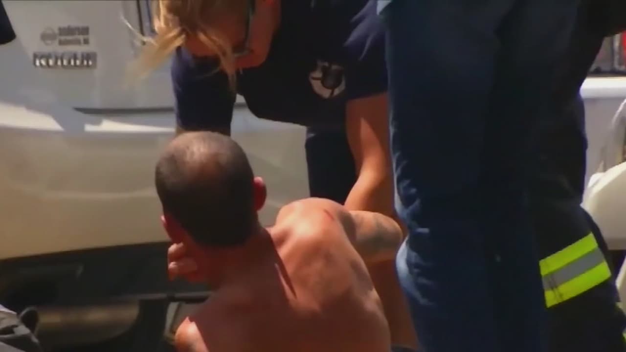 Un reportero que cubría otra noticia pudo registrar en video el momento justo en el que una mujer embarazada arremetiera con su vehículo contra un hombre que minutos antes le había robado su cartera. El sospechoso fue atendido por los paramédicos y luego entregado a la policía.