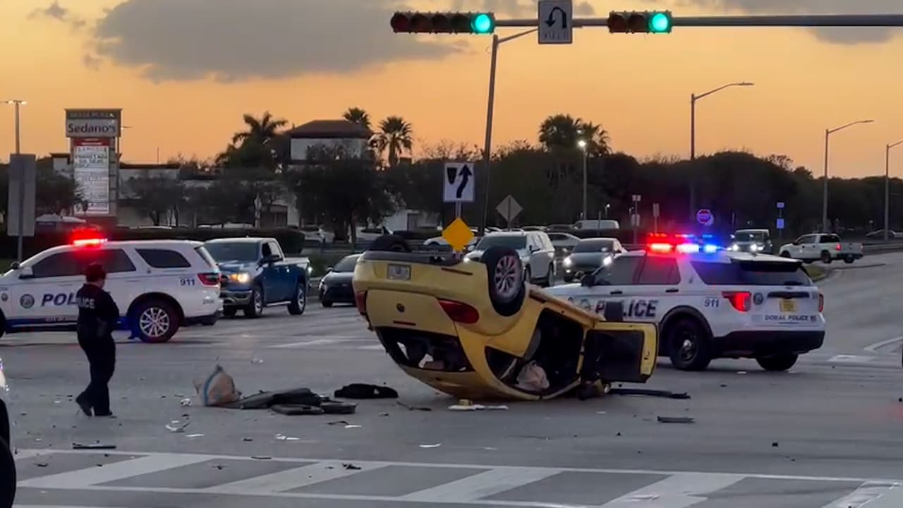 El accidente ocurrió en la intersección de la calle 58 del noroeste y la avenida 107, en Doral. Un auto se volcó en medio del choque y la policía dijo que una mujer fue aerotransportada al centro de trauma del Kendall Hospital, sin heridas que amenazaran su vida. Investigan las causas del choque.
