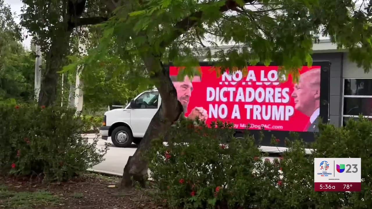 La controversial valla que compara a Donald Trump con Fidel Castro que estaba ubicada cerca de la autopista Palmetto ahora recorre las calles de Miami en un auto publicitario. Al mismo tiempo, seguidores del expresidente Trump compraron una valla cerca a la autopista en la que dicen "No al socialismo Sí a Trump".