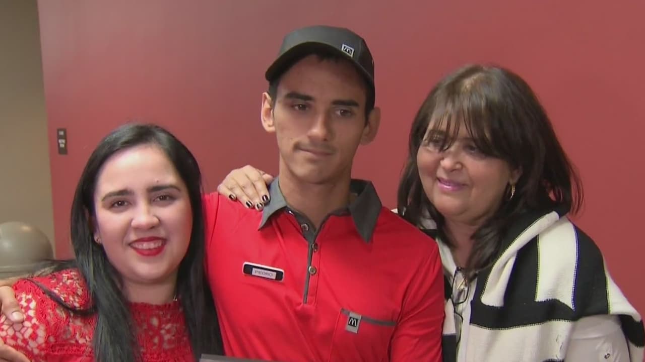 El alcalde de Miami-Dade Carlos Giménez y otros funcionarios rindieron un homenaje al joven, un empleado de McDonald’s, que estaba de turno cuando saltó por la ventana desde un autoservicio para salvarle la vida a una mujer que sufrió un paro cardíaco.