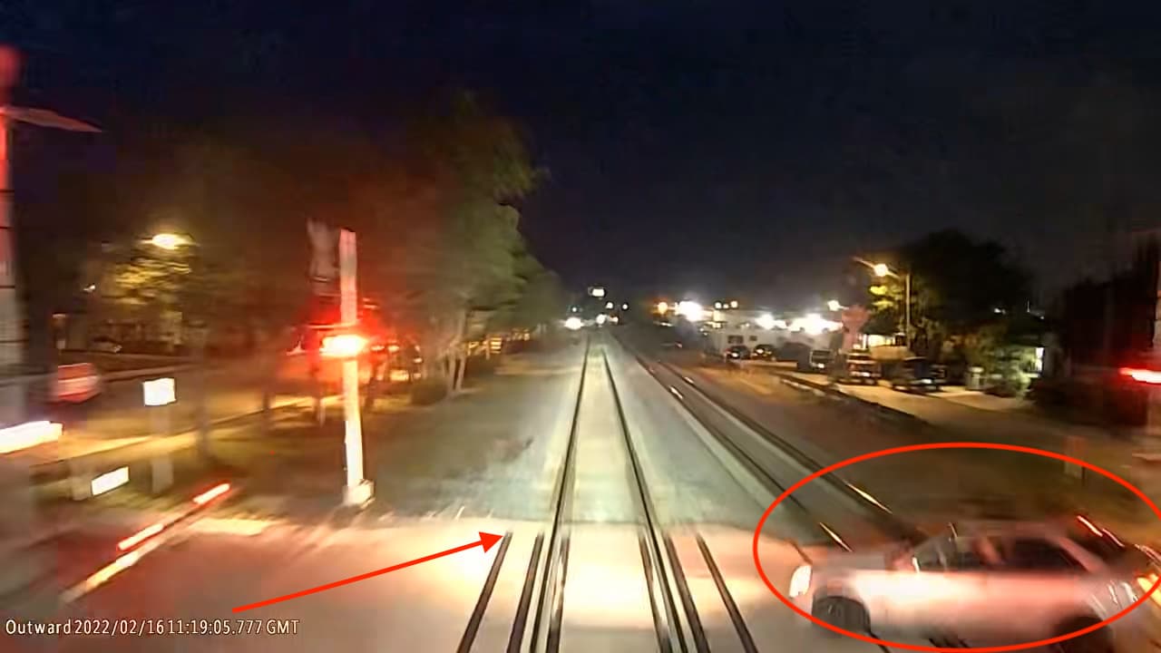 Un video de seguridad captado por la cámara de un tren de la empresa Brightline, muestra el momento en que una camioneta, la cual ignora las señales de tráfico, choca aparatosamente con el ferrocarril.