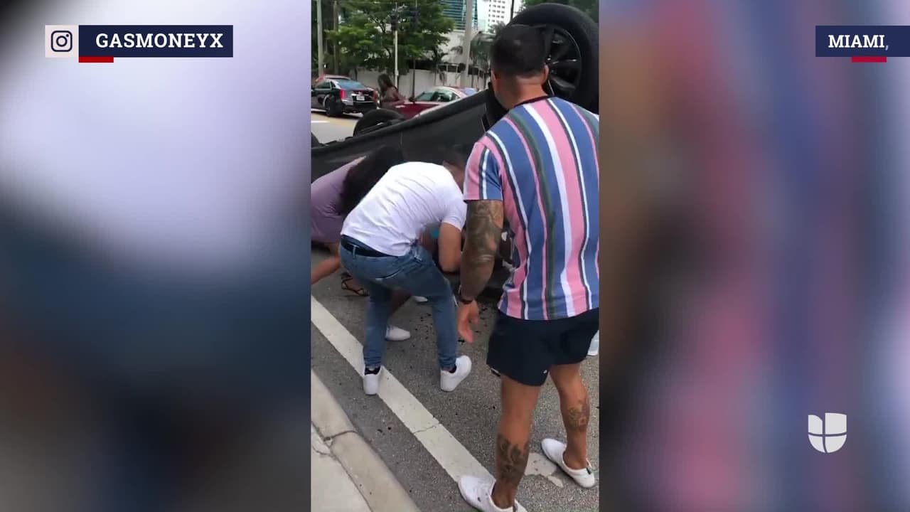El video, publicado en las redes sociales, muestra segundos después de que una SUV marca Lexus se vuelca en el área de Brickell, en el centro Miami. Testigos se acercan y ayudan a salir a las personas atrapadas en el carro.