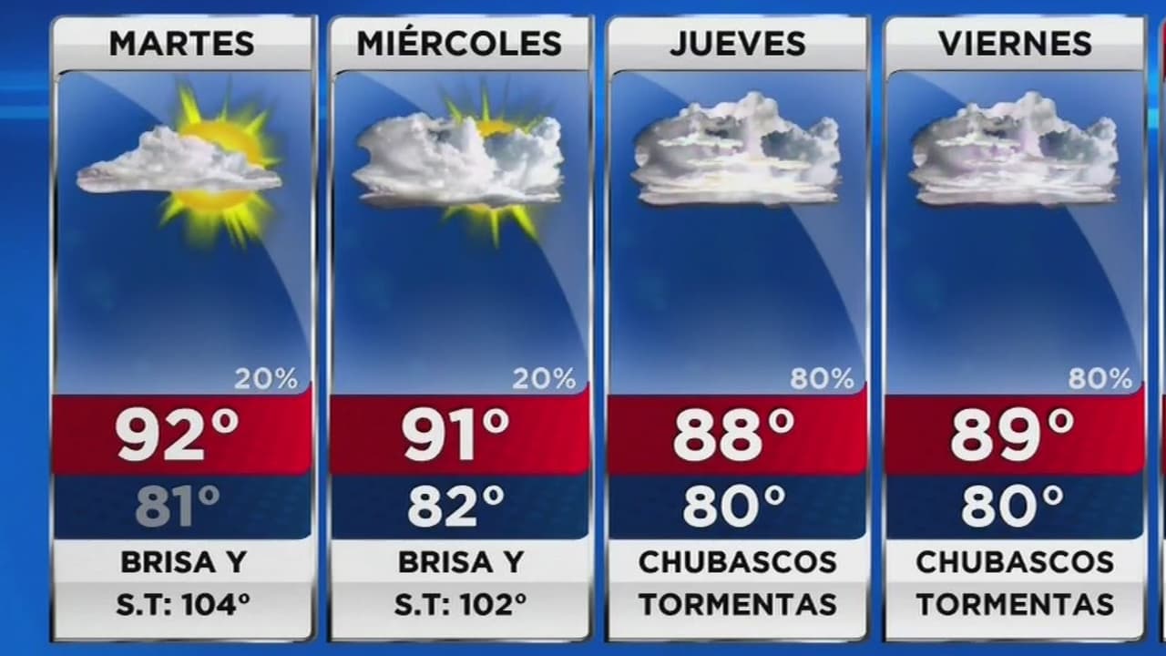 A pesar de que habrá un poco de nubosidad, el calor se mantiene para este martes. La temperatura máxima para hoy será de 92 grados, con una sensación térmica que alcanzará los 104 grados.