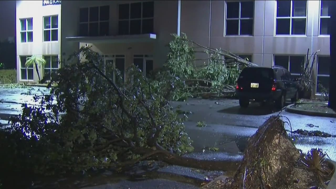 En un complejo de apartamentos en Doral se registró la caída de varios árboles, causando daños en al menos una de las viviendas. Las autoridades no reportan personas lesionadas, pero reiteran las recomendaciones de precaución.
