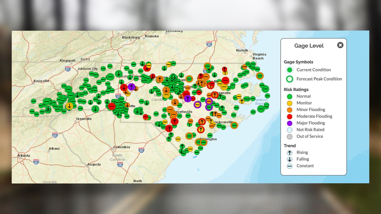El NCEM ofrece una herramienta en línea para conocer los niveles de los ríos (hacer clic aquí). El río Neuse en Smithfield está bajo un riesgo de grandes inundaciones. De acuerdo al pronóstico, otros ríos como Haw, Cape y Tar podrían desbordarse el fin de semana.