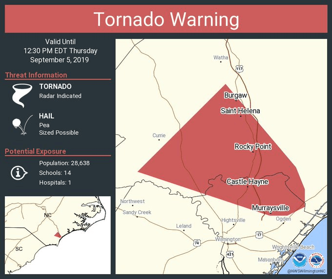 El Centro Nacional de Meteorología emitió una advertencia de tornados, huracanes, inundaciones y riesgos para surfistas en gran parte del estado, incluyendo el triángulo de Carolina del Norte.