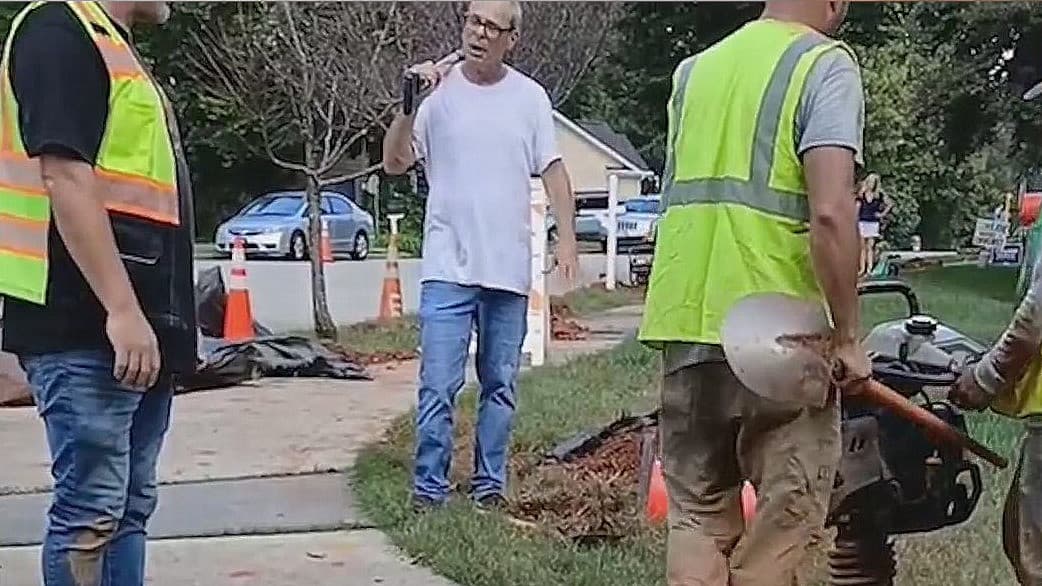 En el video, se ve a un hombre con una pala que amenaza con golpear a varios trabajadores que se encuentran con sus equipos de trabajo haciendo reparaciones en la acera de una calle en el norte de Raleigh.